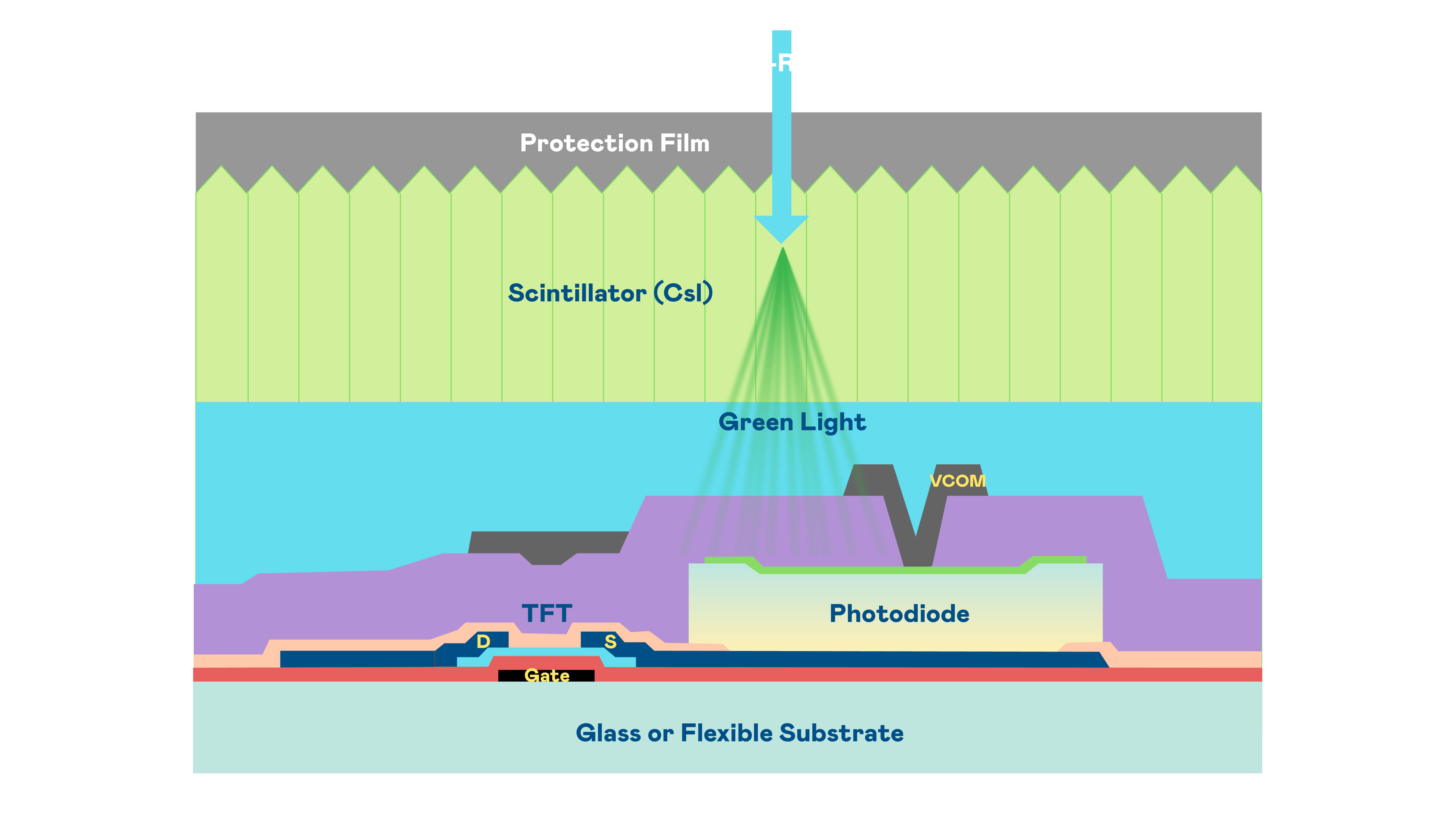 J9集团的X光影像感测阵列使用薄膜电晶体 (TFT) 作为每个像素的读取开关,搭配光电二极体(Photodiode)的光电转换元件,用以感测X光影像讯号。